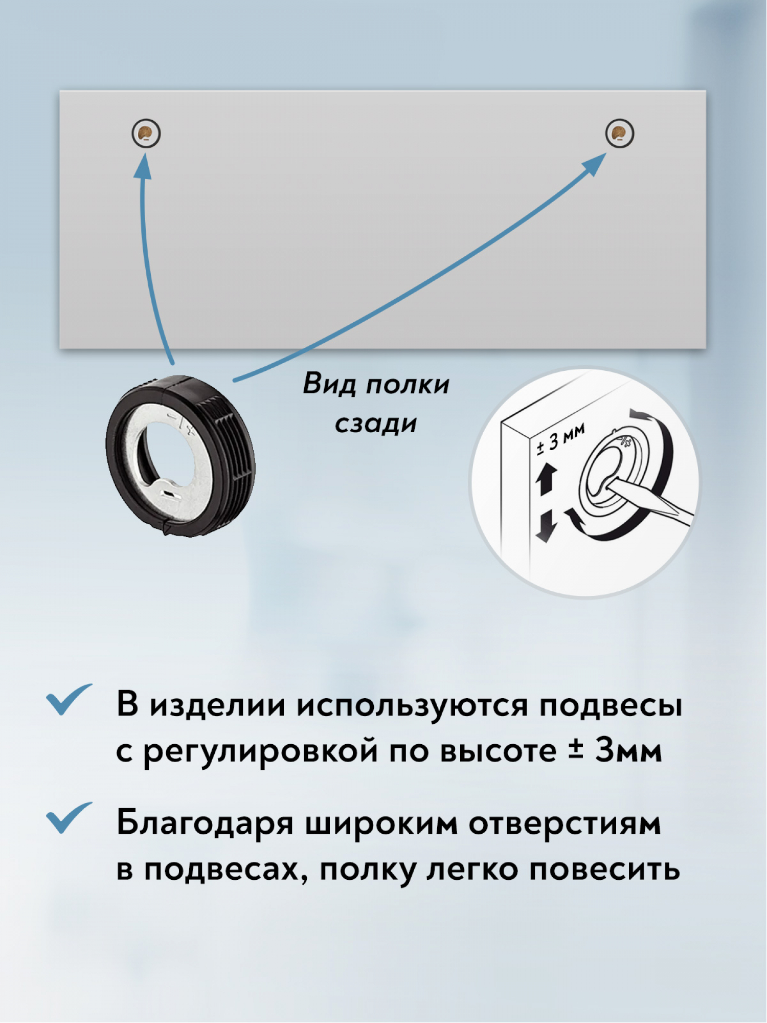 - для следующих элементов изделия: завесы, направляющие ящиков, поднимающих кронштейнов, элементов освещения, эксцентриков, ручек для мебели – 12 месяцев от даты продажи изделия при предъявлении действительного документа, подтверждающего покупку.