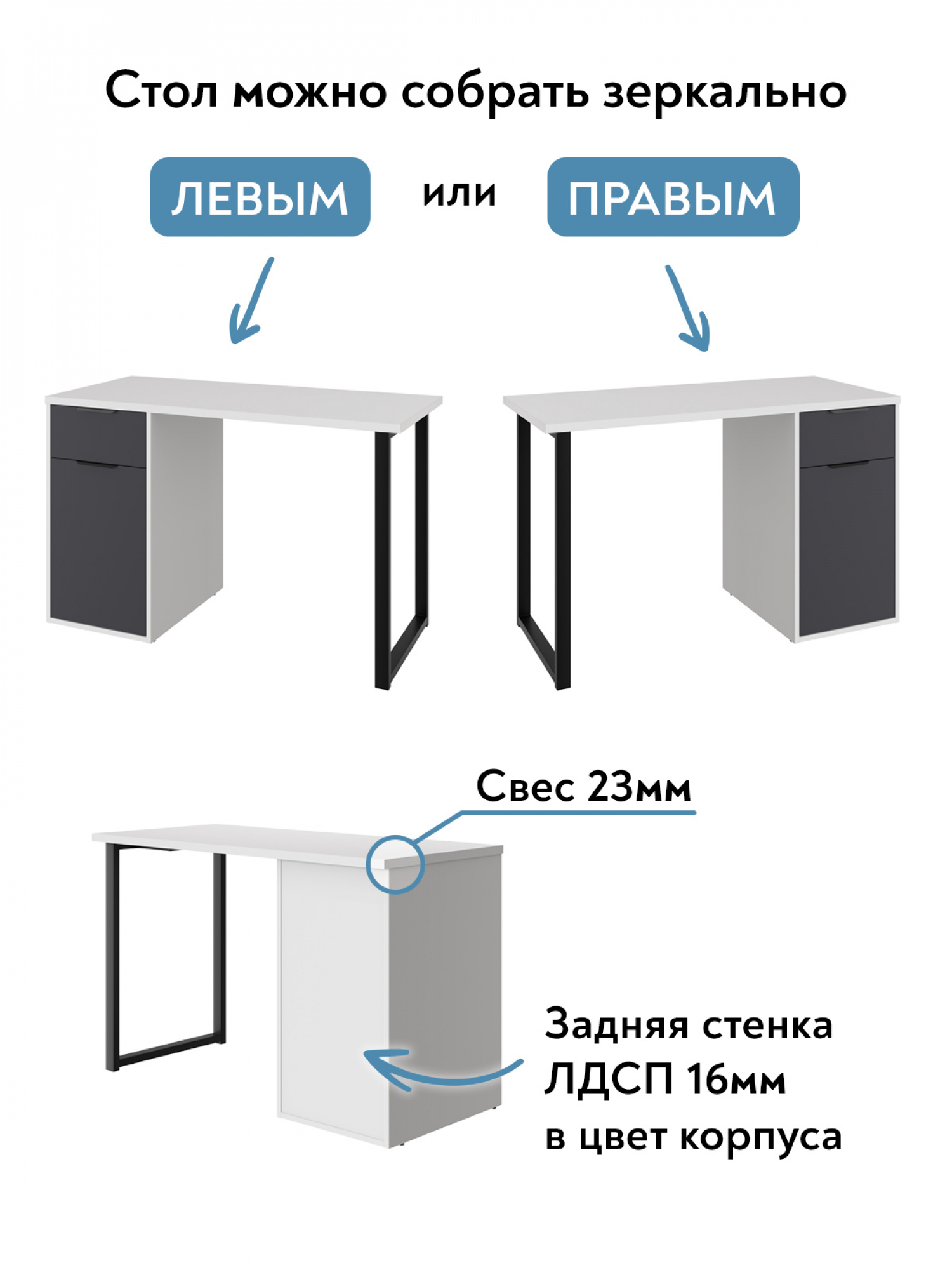 - Зеркальная сборка: возможность собрать стол в «правом» или «левом» варианте для удобства размещения в любом помещении.