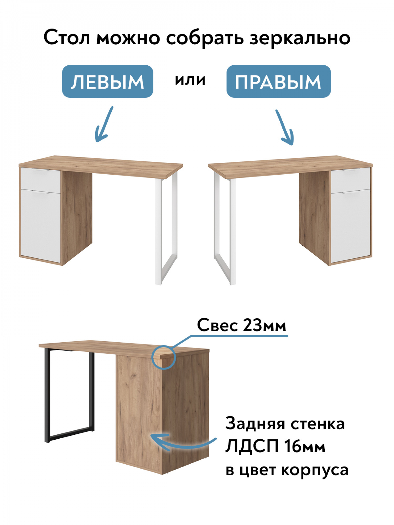 - Зеркальная сборка: возможность собрать стол в «правом» или «левом» варианте для удобства размещения в любом помещении.