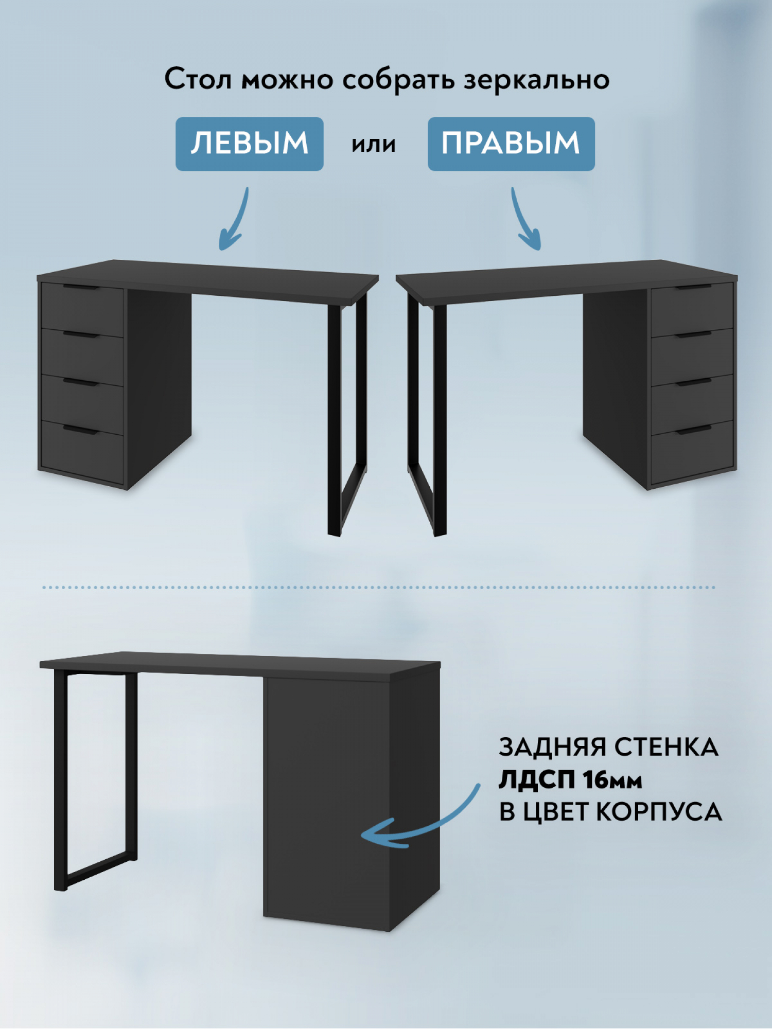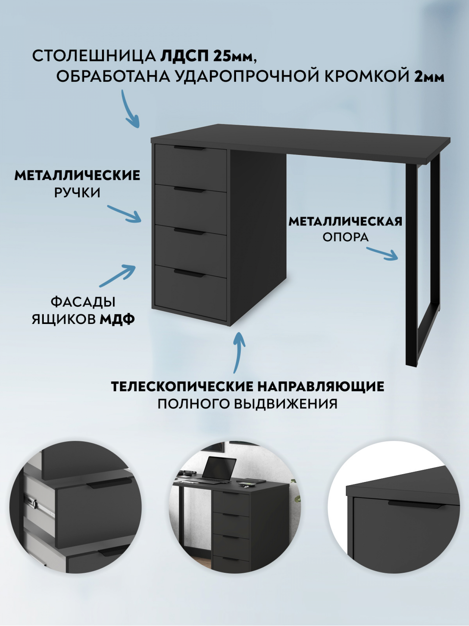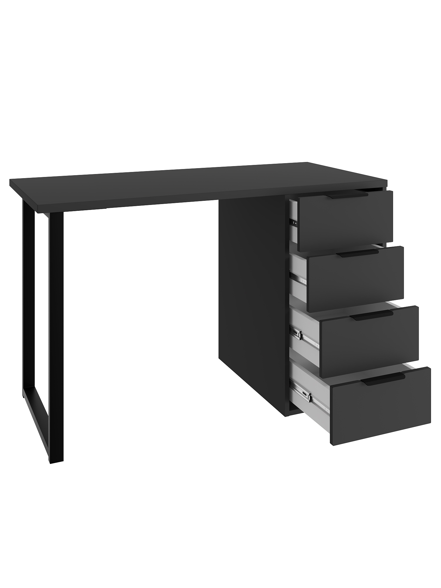Стол письменный, компьютерный С-400 позволит создать комфортное и стильное рабочее пространство в офисе или домашнем кабинете. Стол С-400 можно использовать в качестве маникюрного стола. Стол имеет прочную стальную опору и тумбу с четырьмя выдвижными ящиками. Столешница изготовлена из ЛДСП 25 мм, фасады МДФ 16 мм. Дно ящика двп 3 мм. Стол может быть собран в зеркальном варианте «правым» или «левым». Фурнитура: телескопические направляющие полного выдвижения без доводчиков, ручки и опора металл.
