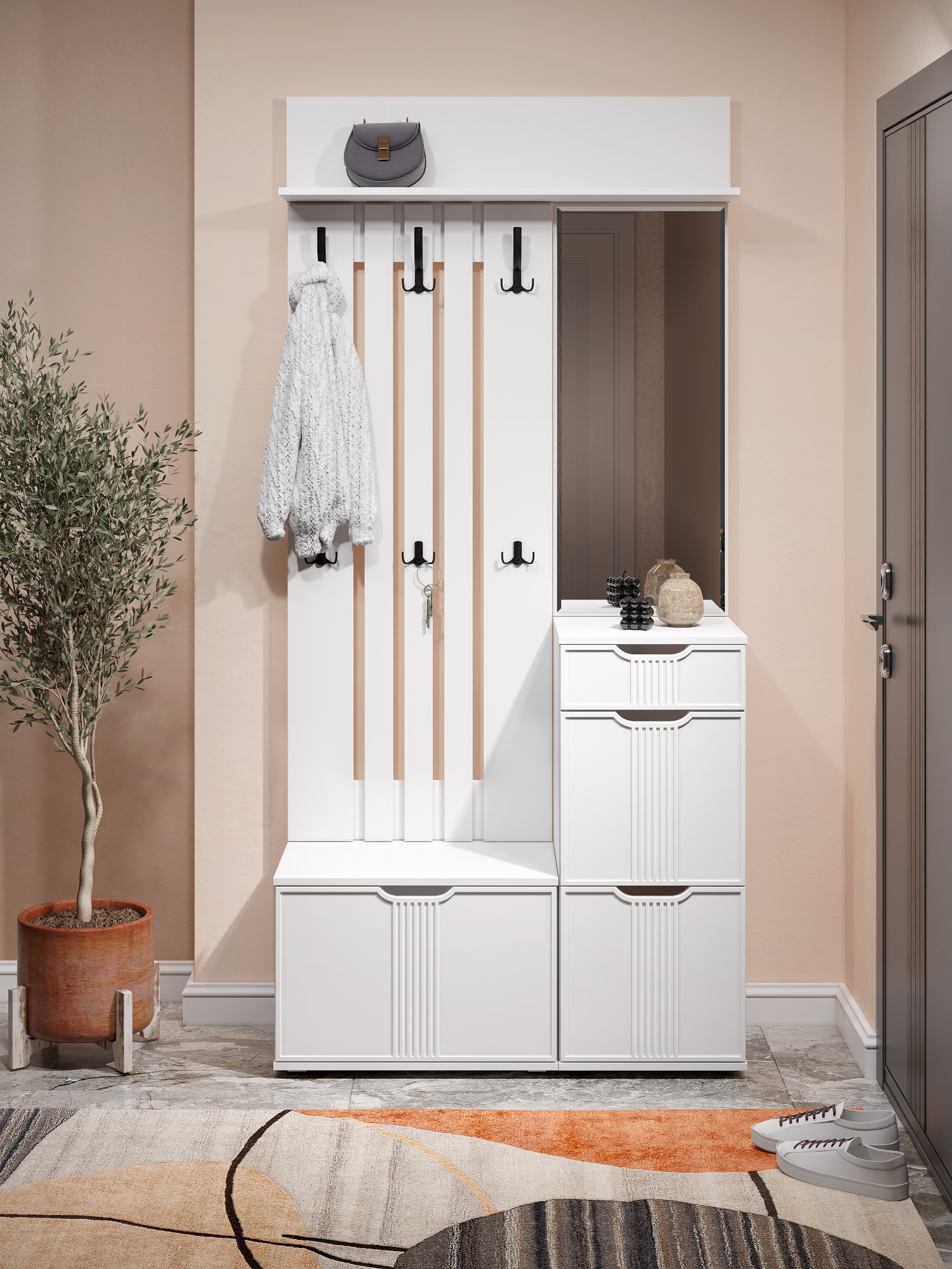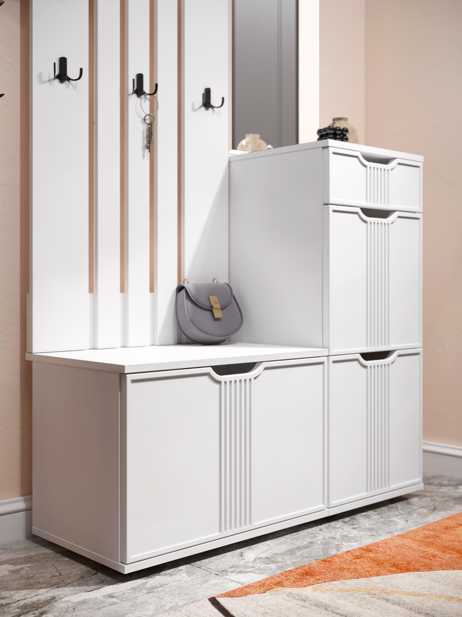 Тумба Эмилия ЭЛ-4 прекрасно подойдет для хранения обуви и других вещей. Сочетая тумбу с другими модулями из коллекции Эмилия, Вы можете создать стильную и лаконичную прихожую у себя дома. Свес крышки в 30 мм обеспечит прилегание к стене с любым плинтусом.